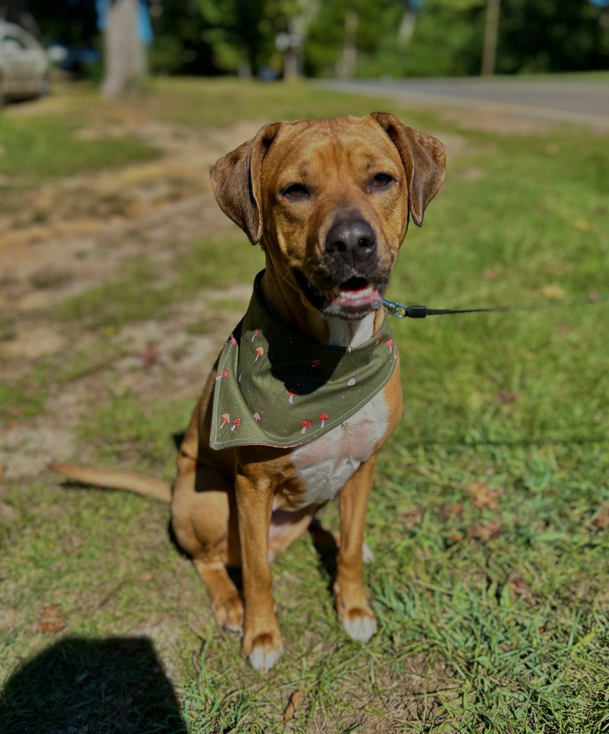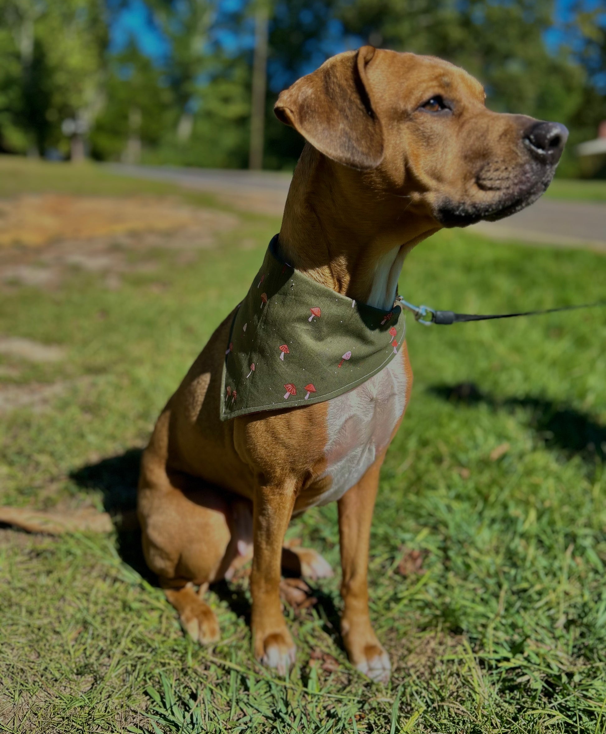 Embrace the cozy, whimsical side of nature! This olive green, snap-on bandana features a classic pattern of tiny red mushrooms! It’s the perfect accessory for autumn walks, forest adventures, or simply bringing a touch of cottagecore magic to your dog's daily look.